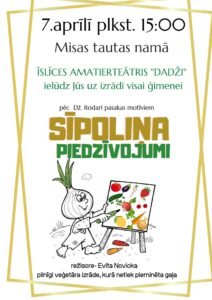 Misas tautas namā 7. aprīlī plkst. 12 Īslīces amatierteātra «Dadži» izrāde visai ģimenei «Sīpoliņa piedzīvojumi».