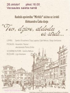 Vecsaules saieta namā 26. oktobrī plkst. 16 radošā apvienība «Mirklis» aicina uz izrādi «Tev, dzīve, atdodu es sirdi…» – Aleksandra Čaka dzeja.