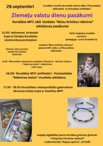 29. septembrī Rundāles MCF zālē izstādes «Mūsu Arktikas nākotne» atklāšanas pasākums: plkst. 11 iedvesmas brokastis kopā ar Dānijas Karalistes vēstniecības pārstāvjiem; plkst. 18 Rundāles MFC amfiteātrī fotoizstādes «Nākotnes balsis» muzikāla atklāšana; plkst. 17.30 – 19 draudzības rokassprādzīšu gatavošana.