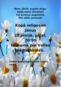 Laukumā pie Valles pamatskolas 22. jūnijā plkst. 20 Jāņu ielīgošana.