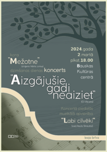 Bauskas kultūras centrā 2. martā plkst. 18 jauktā kora «Mežotne» (diriģente Mārīte Jonkus) dzimšanas dienas koncerts «Aizgājušie gadi neaiziet».