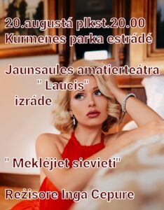 Kurmenes parka estrādē 20. augustā plkst. 20 Jaunsaules amatierteātra «Laucis» izrāde «Meklējot sievieti». Režisore Inga Cepure.