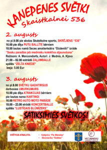 3. augustā no plkst. 8 svētku gadatirgus, plkst. 10 pie dīķa atrakcijas bērniem, pie tautas nama – kartingi, plkst. 16 retro auto moto parāde, plkst. 18 estrādē koncertballe.