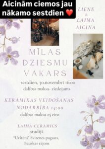 «Laima Ceramics» studijā Svitenes pagasta «Urštēnos» 30. novembrī plkst. 14 keramikas veidošanas nodarbība, plkst. 16 mīlas dziesmu vakars.