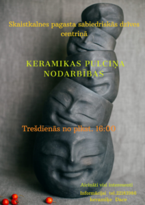 Skaistkalnes pagasta sabiedriskās dzīves centrā 14. februārī plkst. 16 keramikas pulciņa nodarbība.