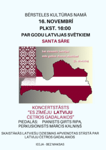 Bērsteles kultūras namā 16. novembrī plkst. 16 koncertprogramma «Es zīmēju Latviju četros gadalaikos» – Santa Sāre, perkusionists Mārcis Kalniņš un pianists Ģirts Rips.