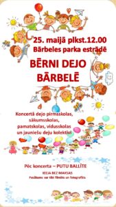 Bārbeles parka estrādē 25. maijā plkst. 12 pirmsskolas, sākumskolas, pamatskolas, vidusskolas un jauniešu deju kolektīvu koncerts «Bērni dejo Bārbelē».