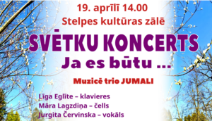 Stelpes kultūras zālē19. aprīlī plkst. 14 koncerts «Ja es būtu…» – muzicē trio «JUMALĪ». Klavieres – Līga Eglīte, Čells – Māra Lagzdiņa, vokāls – Jurgita Červinska.