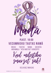 Vecumnieku tautas namā 8. martā plkst. 18 Misas tautas nama sieviešu ansambļa «Vēja meitas» koncerts «Kad mīlestība smaržot sāk!».