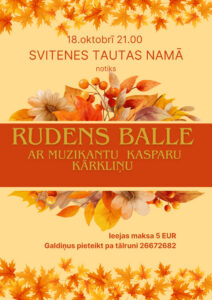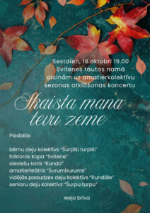 Svitenes tautas namā 18. oktobrī plkst. 19 koncerts «Skaista mana tēvu zeme», plkst. 21 rudens balle ar muzikantu Kasparu Kārkliņu.