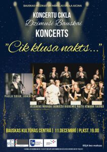 Bauskas Kultūras centrā 11. decembrī plkst. 19 koncertu cikla «Dzimuši Bauskai» koncerts «Cik klusa nakts» – Paula Saija (vokāls), Jelgavas novada jauniešu bigbends Raita Ašmaņa vadībā.
