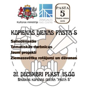Bauskas kopienas centrā «Pasta 5» 21. decembrī plkst. 15 kopienas dienas: saliedēšanās, tematiskās darbnīcas, jauni projekti, Ziemassvētku rotājumi, dāvanas.