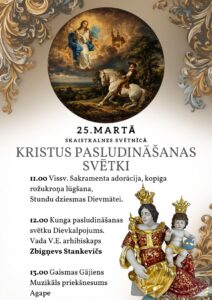 Skaistkalnes svētnīcā 25. martā Kristus pasludināšanas svētki: plkst. 11 Vissv. Sakramenta adorācija, kopīga rožukroņa lūgšana, stundu dziesmas Dievmātei, plkst. 12 Kunga pasludināšanas svētku dievkalpojums (vada V.E. arhibīskapsZbigņevs Stankevičs), plkst. 13 gaismas gājiens, muzikāls priekšnesums, agape.