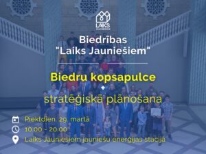«Laiks jauniešiem» jauniešu enerģijas stacijā 29. martā plkst. 10 biedru kopsapulce, stratēģiskā plānošana.