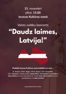 Iecavas Kultūras namā 15. novembrī plkst. 15 Latvijas Republikas proklamēšanas dienai veltīts svētku koncerts «Daudz laimes, Latvija!».