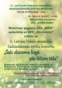 Mežotnes pagasta DFC «Strēlnieki» 18. maijā plkst. 14 11. Latvijas vokālo ansambļu sadziedāšanās svētku koncerts «Šalc dziesma liegā pār līčiem tālu».