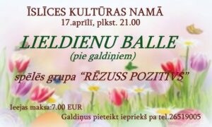 Īslīces kultūras namā 17. aprīlī plkst. 21 Lieldienu balle pie galdiņiem. Spēlēs grupa «Rēzuss pozitīvs».