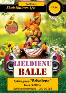 Skaistkalnes tautas namā 17. aprīlī plkst. 22 Lieldienu balle ar grupu «Brīvdiena».