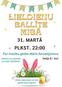 Misas tautas namā 31. martā plkst. 22 Lieldienu ballīte kopā ar Māri Sevastjanovu.