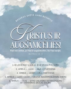 Lieldienu laika dievkalpojumi Bauskas luterāņu baznīcā: 2. aprīlī plkst. 18.30, 3. aprīlī plkst. 10, 5. aprīlī plkst. 6 un 10, 6. aprīlī plkst. 10.