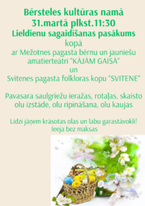 Bērsteles kultūras namā 31. martā plkst. 11.30 Lieldienu sagaidīšanas pasākums.