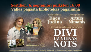 Valles bibliotēkas pagalmiņā 6. septembrī plkst. 16 literāri muzikāla tikšanās ar rakstnieci Daci Judinu un komponistu Arturu Nīmani.