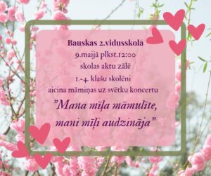 Bauskas 2. vidusskolā 9. maijā plkst. 12 1. – 4. klašu Māmiņdienas svētku koncerts «Mana mīļa māmulīte mani mīļi audzināja».
