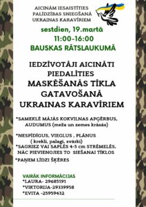 Bauskas Rātslaukumā 19. martā no plkst. 11 līdz 16 maskēšanās tīkla gatavošana Ukrainas karavīriem.