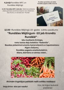 «Rundāles mājtirgū» plkst. 12 «Rundāles mājtirgum – 10 jeb «Kronēts Rundālē»: ielu muzikants Kristaps, romu tautas deju kolektīvs «Rademila», Bauskas pūšaminstrumentu kamerorķestris ar kapelmeistaru Aigaru Dziļumu, Rundāles pagasta amatierkolektīvi, ēšana, dzeršana un atmiņu stāsti.