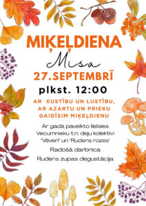 Misā 27. septembrī plkst. 12 Miķeļdienas svinības kopā ar Vecumnieku tautas nama deju kolektīviem «Vēveri» un «Rudens rozes». Radošā darbnīca, rudens zupas degustācija.