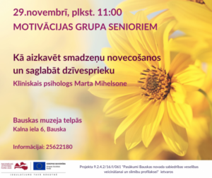 Bauskas muzeja telpās 29. novembrī plkst. 11 motivācijas grupa senioriem «Kā aizkavēt smadzeņu novecošanos un saglabāt dzīvesprieku» ar klīnisko psiholoģi Martu Mihelsoni.