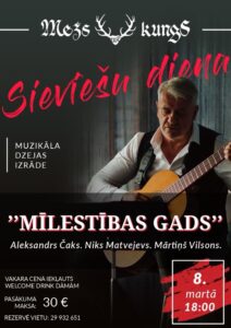 Restorānā «Mežs Kungs» Bauskā 8. martā plkst. 18 muzikāla dzejas izrāde «Mīlestības gads». Aleksandrs Čaks. Niks Matvejevs. Mārtiņš Vilsons.