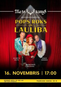 Restorānā «Mežs kungs» 16. novembrī plkst. 17 muzikāla komēdija «Pops, roks un laulība» – Guntis Veits, Raimonda Vazdika, Jānis Jarāns.