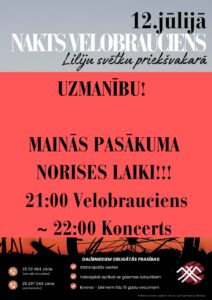 Vecumnieku Liliju svētku priekšvakarā 12. jūlijā plkst. 21 nakts velobrauciens. Sākums plkst. 21 pie Vecumnieku trautas nama. Plkst. 22 – koncerts.