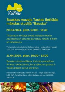 Bauskas muzeja Tautas lietišķās mākslas studijā «Bauska» nemateriālā kultūras mantojuma saglabāšanas pasākums «Satiec savu meistaru!»: 20. aprīlī plkst. 12 – 14.30 tikšanās ar rotkaļa amata mesitaru Hariju Jaunzemu un sarunas par latvju rotām, zīmēm un latviskumu; 21. aprīlī plkst. 10 – 13 Bauskas cimda adīšana. Aicināts piedalīties ikviens rokdarbnieks, kura nākotnes plānos ir noadīt pašam savus dūraiņus.