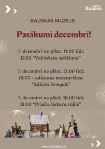 Bauskas muzejā 7. decembrī plkst. 11 – 12.30 «Valriekstu zeltīšana», plkst. 13 – 16 adīšanas meistarklase «Adīsim Zemgalē», plkst. 16 – 18 «Priežu čiekuru rūķis».