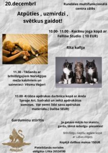 Rundāles multifunkcionālā centra zālēs 20. decembrī pasākums «Atpūties, uzmirdzi, svētkus gaidot!»: plkst. 10 – 11 kucēnu joga kopā ar «Felline Studio», plkst. 11.30 tikšanās ar brīnišķīgajiem Norvēģijas meža kaķēniem un saimnieci Vēsmu Veģeri, plkst. 13 krāšņa apdrukas darbnīca kopā ar «Anda Sproģe Art» (sudrabā un zeltā apdrukātas somiņas), gardumiņu stūrītis, brīnišķīgu ziepīšu iegāde kopā ar «Labas ziepes».
