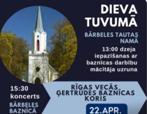 Bārbelē 22. aprīlī plkst. 13 pasākums «Dieva tuvumā»: plkst. 13 tautas namā dzeja, iepazīšanās ar baznīcas darbību, mācītāja uzruna; plkst. 15.30 Bārbeles baznīcā koncerts.