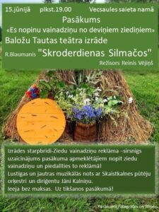 Vecsaules saieta namā 15. jūnijā plkst. 19 pasākums «Es nopinu vainadziņu no deviņiem ziediņiem» – Baložu teātra izrāde «Skroderdienas Silmačos».