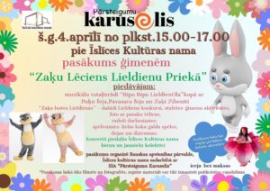 Pie Īslīces kultūras nama 4. aprīlī plkst. 15 – 17 pasākums ģimenēm «Zaķu lēciens Lieldienu priekā».
