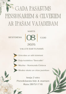 Valles saieta namā 8. martā plkst. 13 gada pasākums pensionāriem un cilvēkiem ar īpašām vajadzībām.
