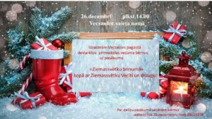 Vecsaules saieta namā 26. decembrī plkst. 14 pasākums Vecsaules pagastā deklarētajiem pirmsskolas vecuma bērniem.