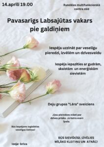 Rundāles multifunkcionālā centra kultūras zālē 14. aprīlī plkst. 19 pavasarīgs labsajūtas vakars pie galdiņiem.