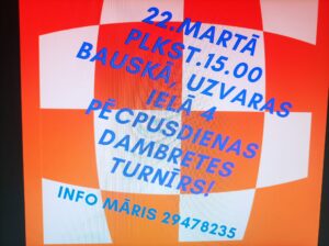 Bauskā, Uzvaras ielā 4, 22. martā plkst. 15 pēcpusdienas dambretes turnīrs.