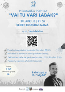 Īslīces kultūras namā 29. aprīlī plkst. 21 pieaugušo popiela «Vai Tu vari labāk?». Pēc tās – dalībniekiem balle kopā ar DJ «MgArt».