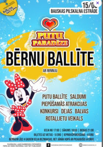 Bauskā, Pilskalna estrādē, 15. jūnijā plkst. 18 «Putu Paradīzes» bērnu ballīte ar dejām putās, piepūšamajām atrakcijām, cukurvati, popkornu, rotaļlietām, konkursiem un balvām un atraktīvo pasākuma vadītāju Minniju.