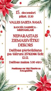 Valles saieta namā 15. decembrī plkst.13.30 radošā darbnīca «Neparastais Ziemassvētku dekors».