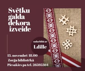 Zorģu bibliotēkā 13. novembrī plkst. 18 radoša bezmaksas nodarbība – svētku galda dekora izveide Latvijas valsts svētkiem sadarbībā ar «I.dilli». Lūgums pieteikt savu dalību, vietu skaits ierobežots.