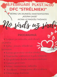 Daudzfunkcionālajā centrā «Strēlnieki» 18. februārī plkst. 14 bērnu un jauniešu amatierteātris «Kājām gaisā» aicina uz radošu tikšanos «No sirds uz sirdi»: lasījumi par mīlestību, sirdi, dvēseli un prieku; spēles; kartīšu gatavošana; piespraudīšu veidošana; fotografēšanās; cepumu gatavošana; filmas kopīga skatīšanās u. c.