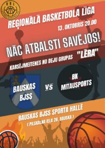 Bauskas BJSS sporta hallē 13. oktobrī plkst. 20 reģionālā basketbola līga: Bauskas BJSS:BK «Mitausports».
